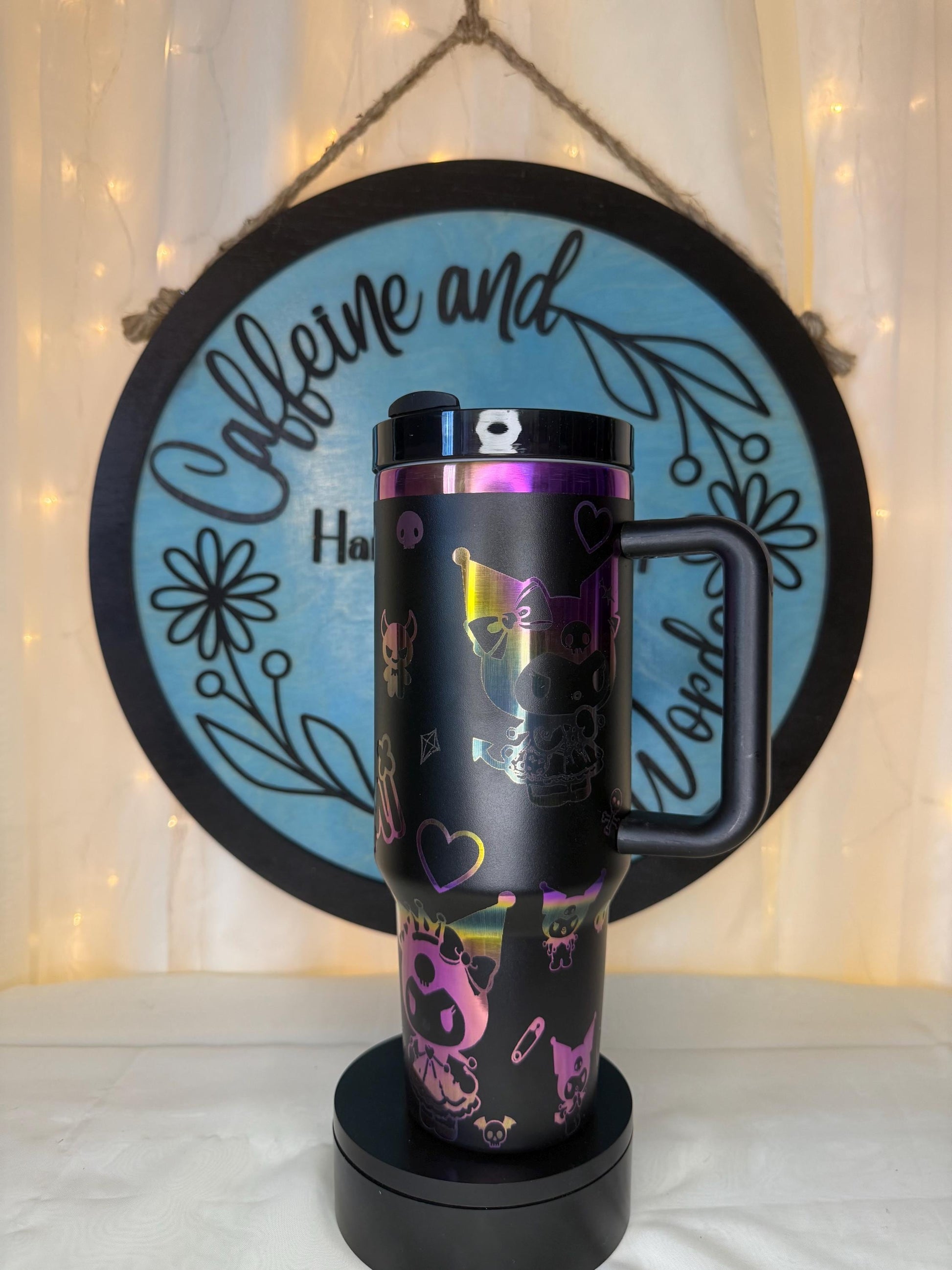 Channel your inner rebel with this stunning 40oz laser-engraved Kuromi tumbler! Perfect for the ultimate Sanrio fan who loves a mix of creepy and cute, this matte black cup features a vibrant, holographic/multi-chrome underlay that shifts beautifully in the light.