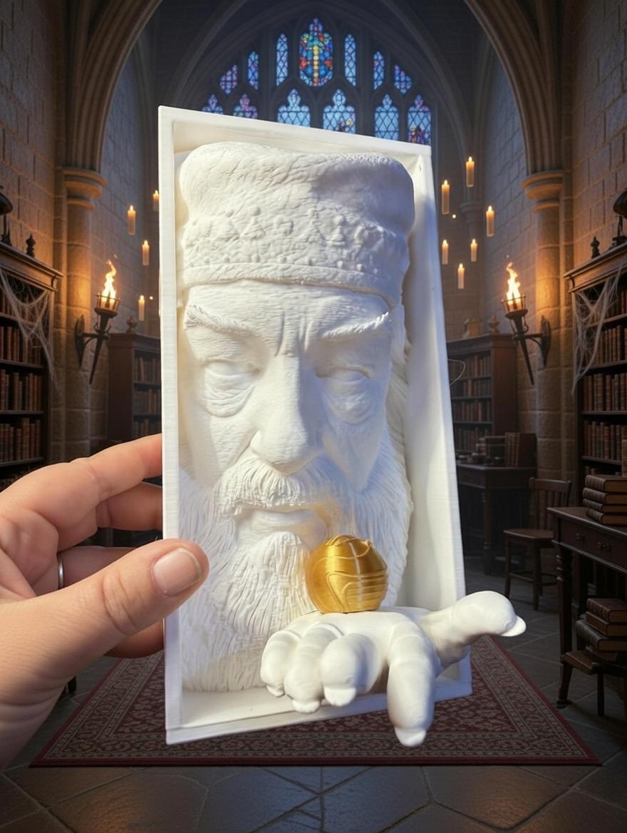 This beautiful 3D-sculpted piece features the wise, serene face of a beloved magical headmaster, complete with his iconic hat, flowing beard, and gentle expression. Emerging elegantly from the frame, his hand stretches outward, presenting a brilliant, contrasting golden winged orb. The crisp white finish of the sculpture allows the intricate textures to shine, while the metallic gold orb creates a captivating focal point.